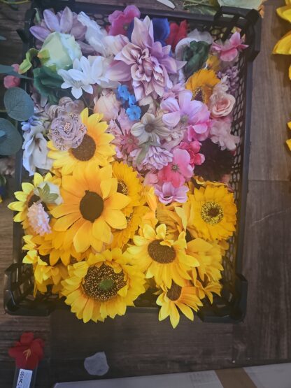 🌸 1 caisse remplie de fleurs détachées variées : tournesols, dahlias, pivoines, roses et petites fleurs multicolores — parfaites pour créations DIY, photobooth, centres de table ou couronnes