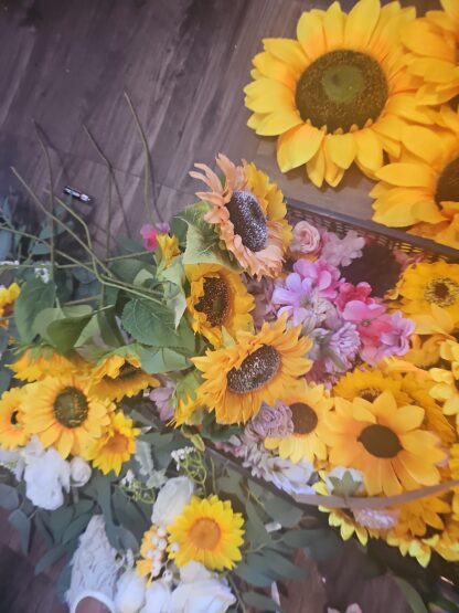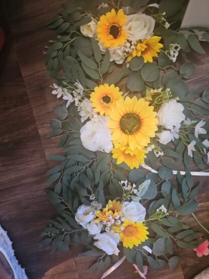 🌻5 compositions florales (type gerbes décoratives) avec tournesols, roses blanches, eucalyptus et petites fleurs, montées sur ruban — idéales pour une arche, un panneau de bienvenue ou une table d’honneur