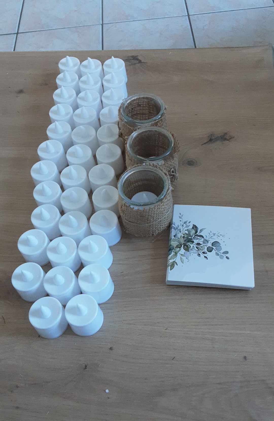 Le lot comprend 38 bougies LED effet flamme, ainsi que 3 photophores en verre habillés de toile de jute pour une ambiance naturelle et élégante.
