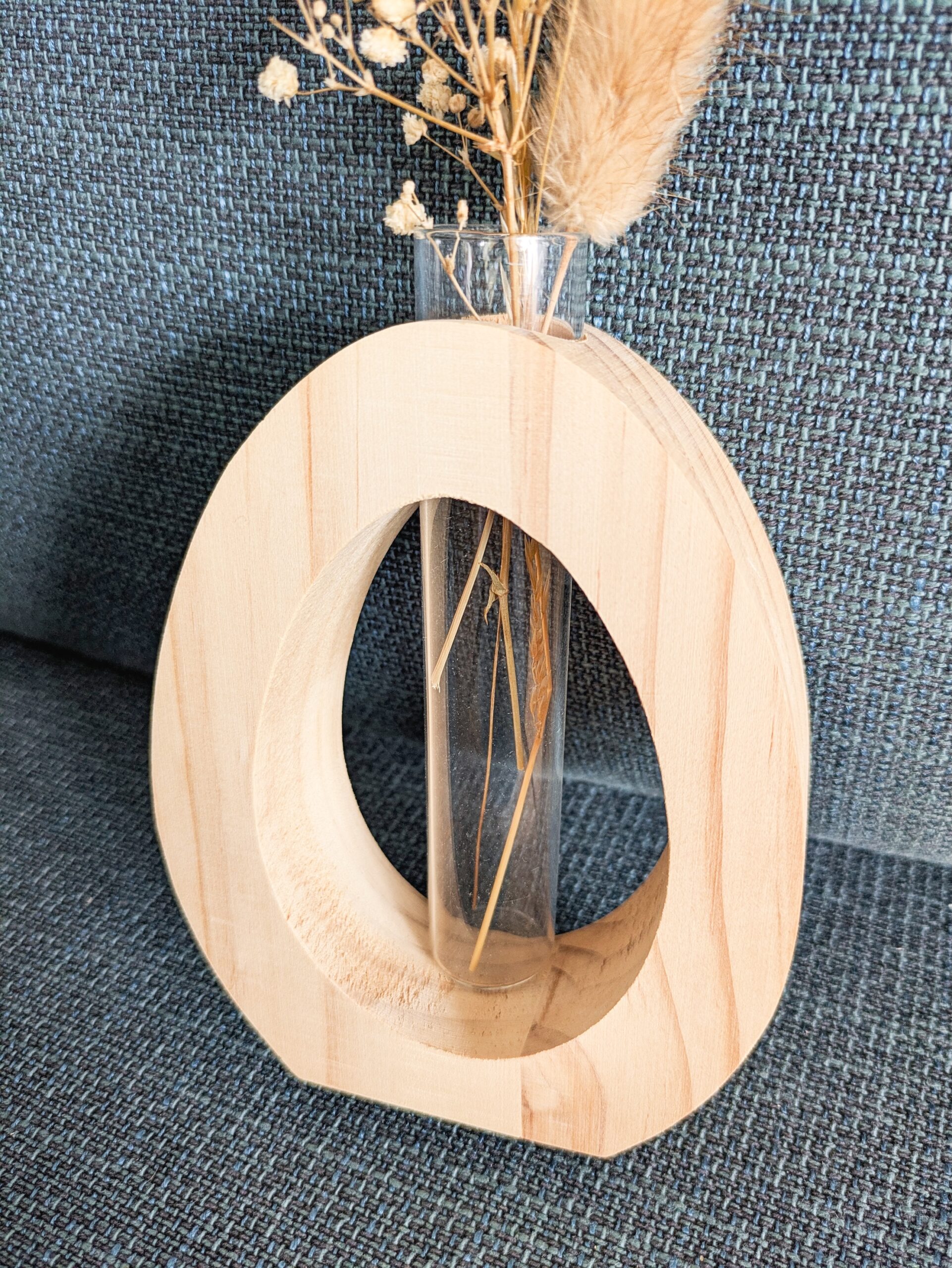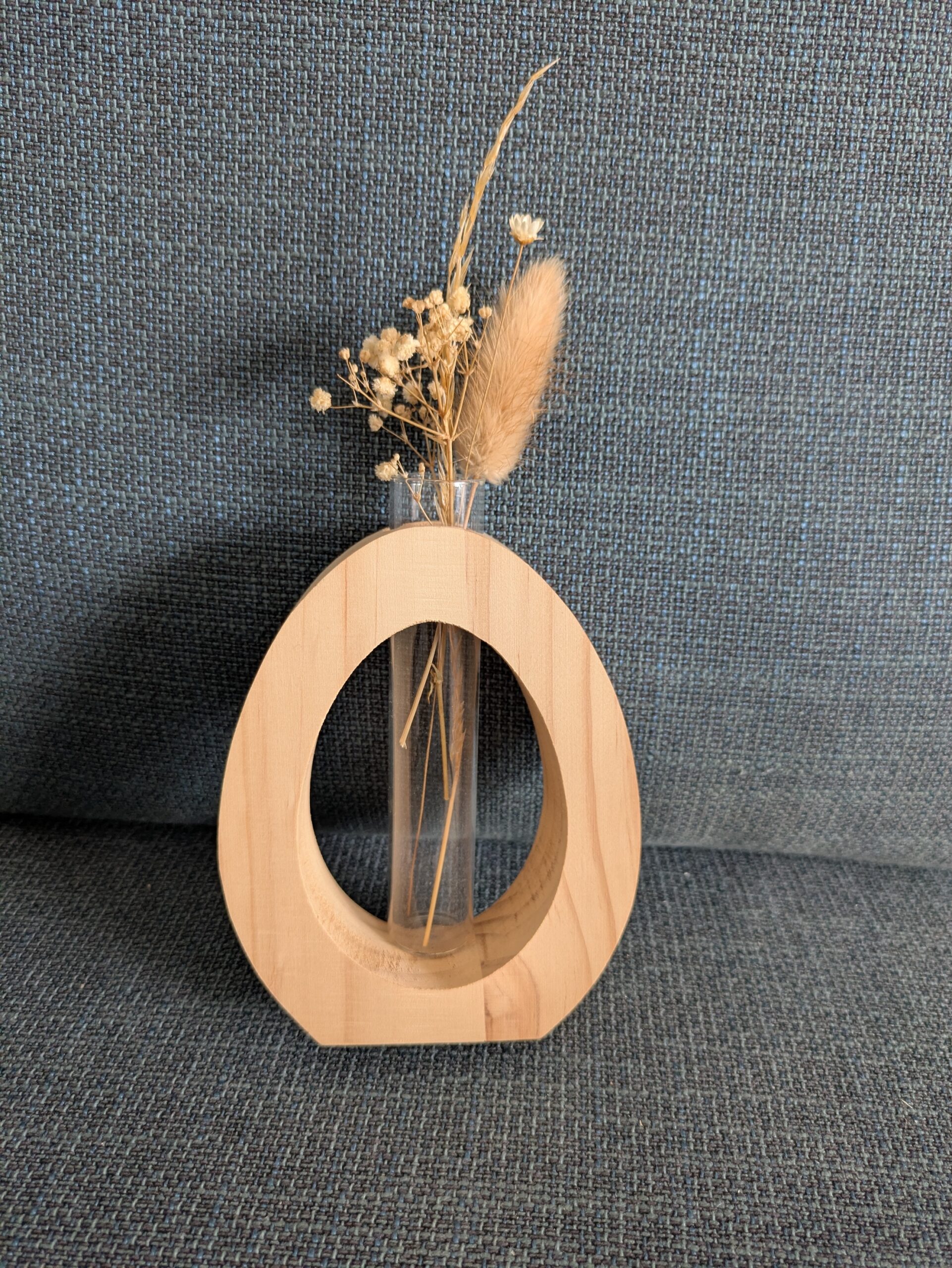 Soliflore en bois de forme ovale et avec un tube en verre pouvant contenir un mini bouquet de fleurs.