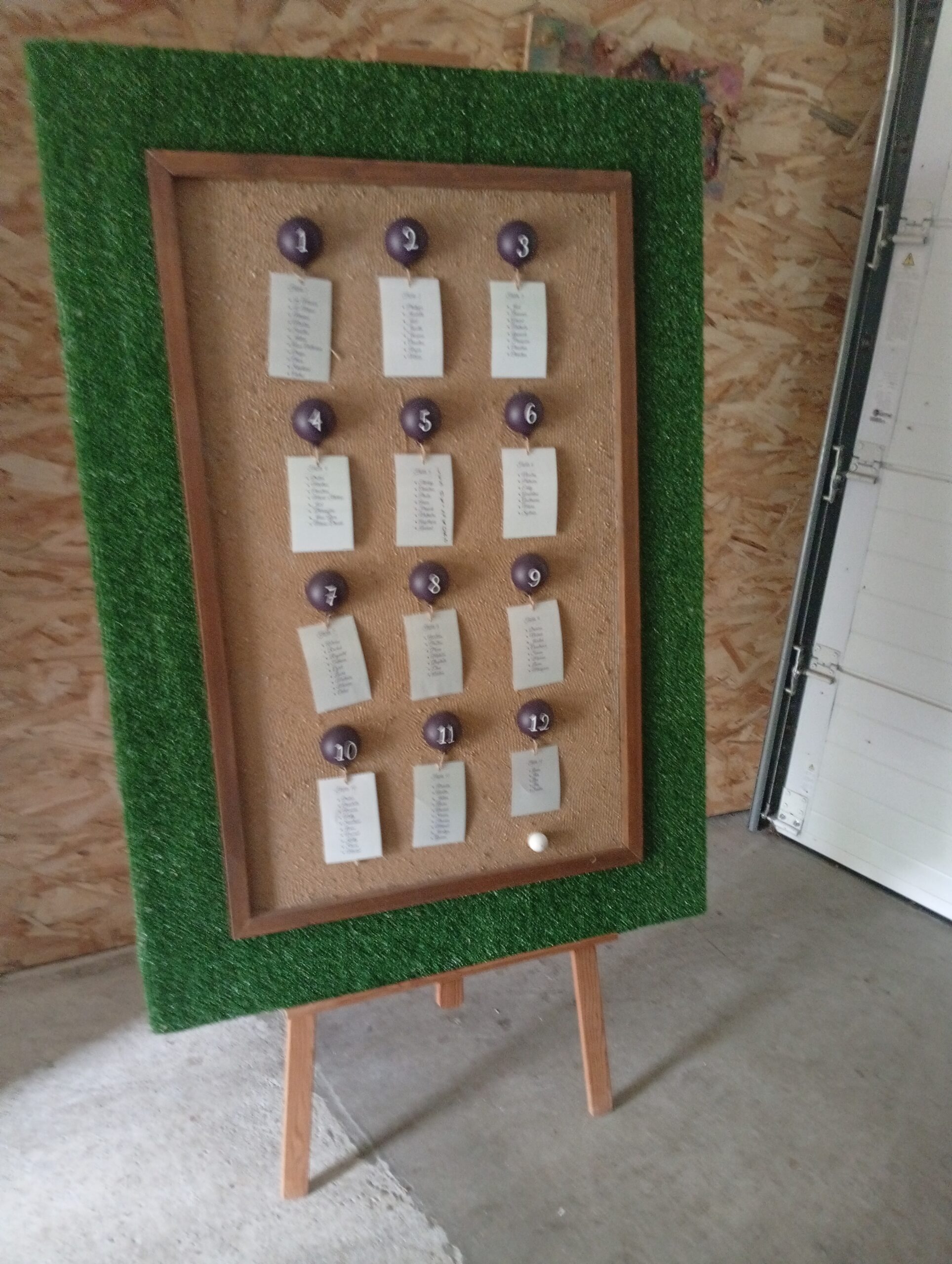 A saisir un plan de table pour fête de famille ou mariage en forme de terrain de pétanque de 90 CMS de large sur 1,30 ml de haut .12  boules représentant les tables.