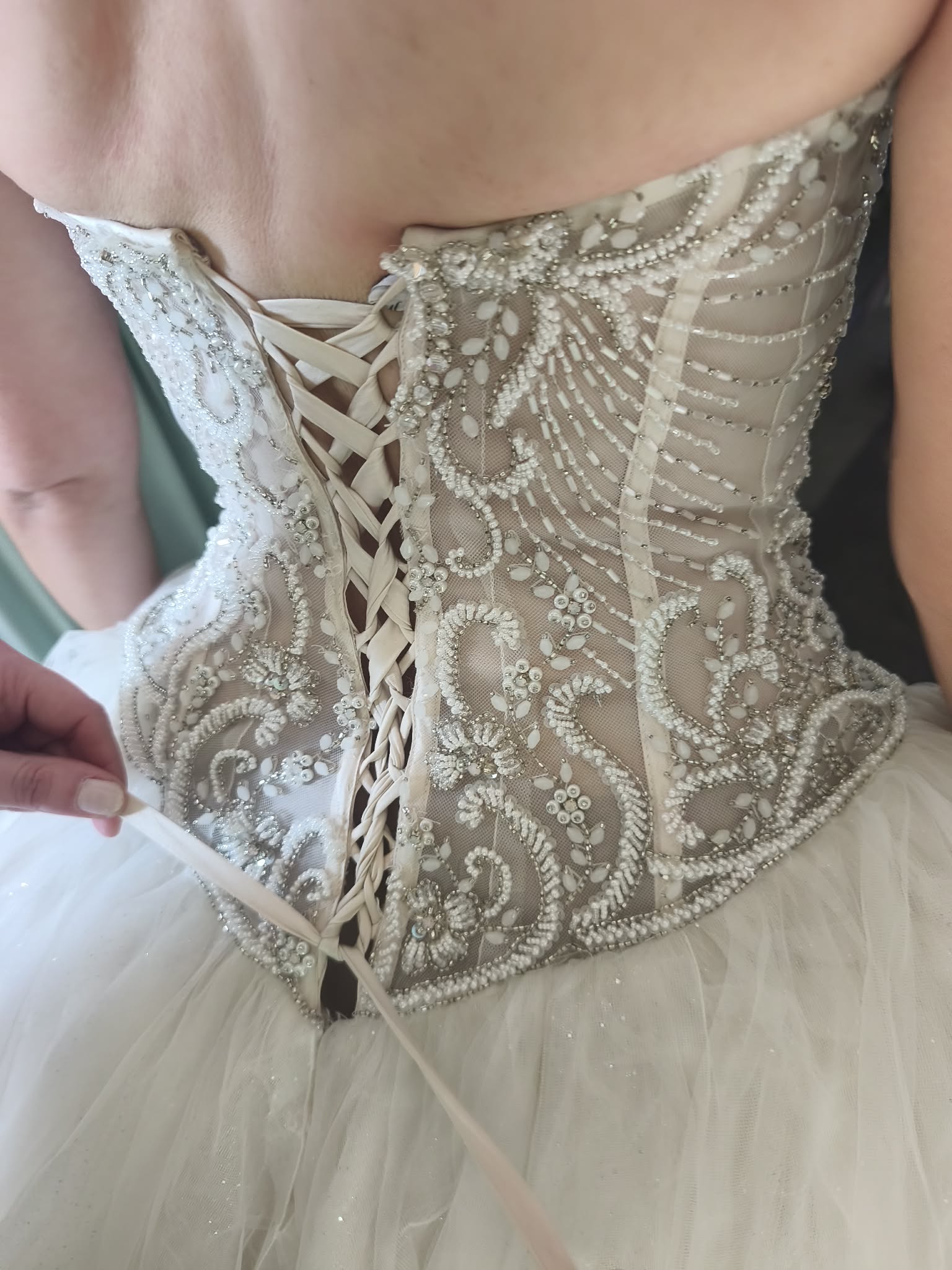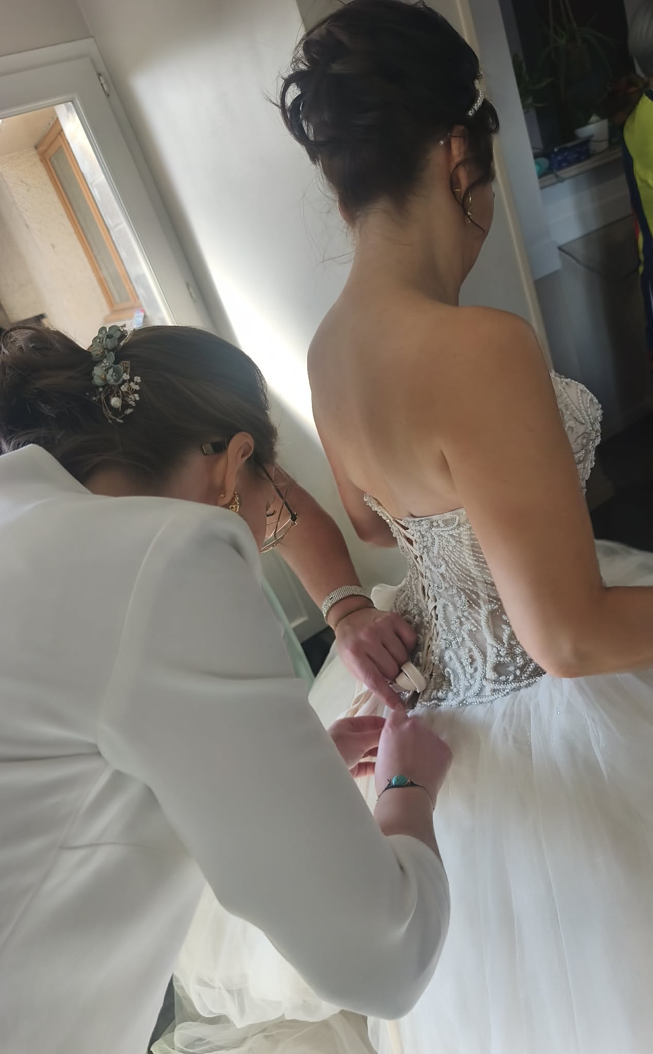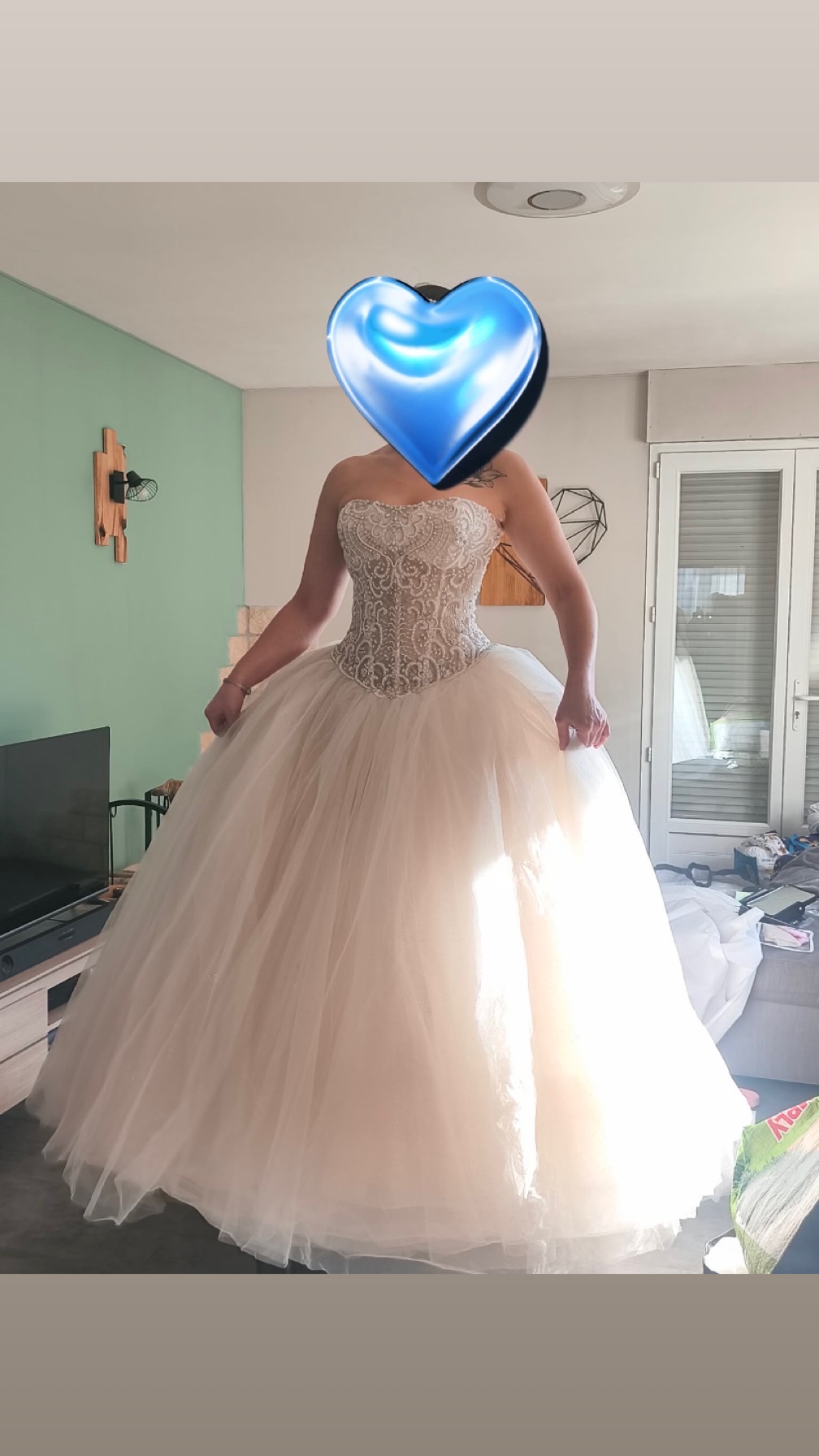 Très jolie robe de mariée bustier avec des perles, lacets dans le dos, pas besoin d’un cerceau tellement il y a des couches de tulle différents, avec une traîne, taille 36/38 facile grâce aux laçages
